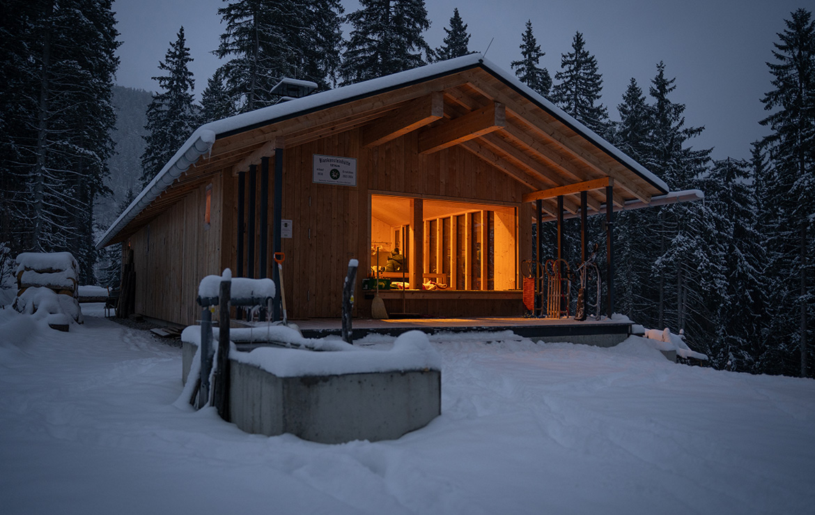 Noch im Dunkeln starteten wir also am Parkplatz der Talstation der Alpspitzbahn – Stirnlampenlicht, kalte Morgenluft und das Knirschen der Reifen auf dem Schotter begleiteten uns. Der breite Forstweg schlängelt sich in weiten Kehren durch den Wald, mal sanft ansteigend, dann wieder etwas steiler, vorbei an dichten Fichten und kleinen Lichtungen, aus denen der Blick hinunter ins Tal blitzt. Mit jedem Höhenmeter weicht die Nacht langsam einem blassen Morgenlicht und nach rund 1.400 überwundenen Höhenmetern erreichen wir die Bergstation auf etwa 2.050 Metern – genau rechtzeitig, um die ersten Sonnenstrahlen über den Gipfeln aufleuchten zu sehen.