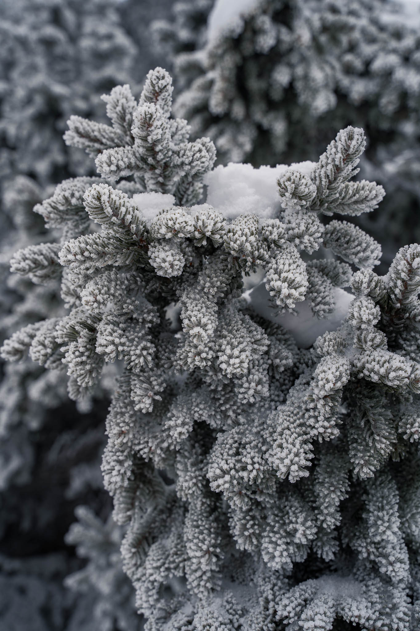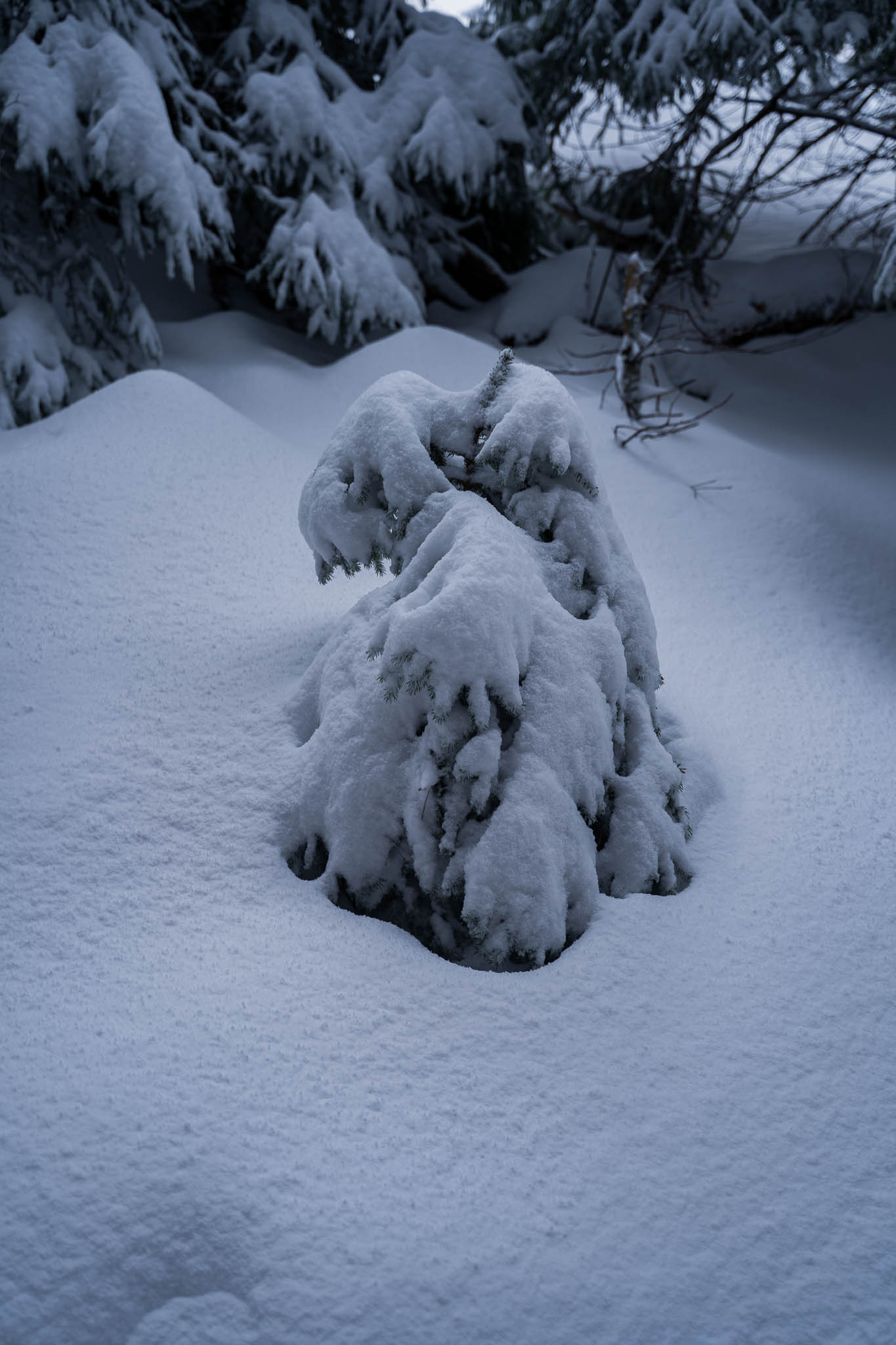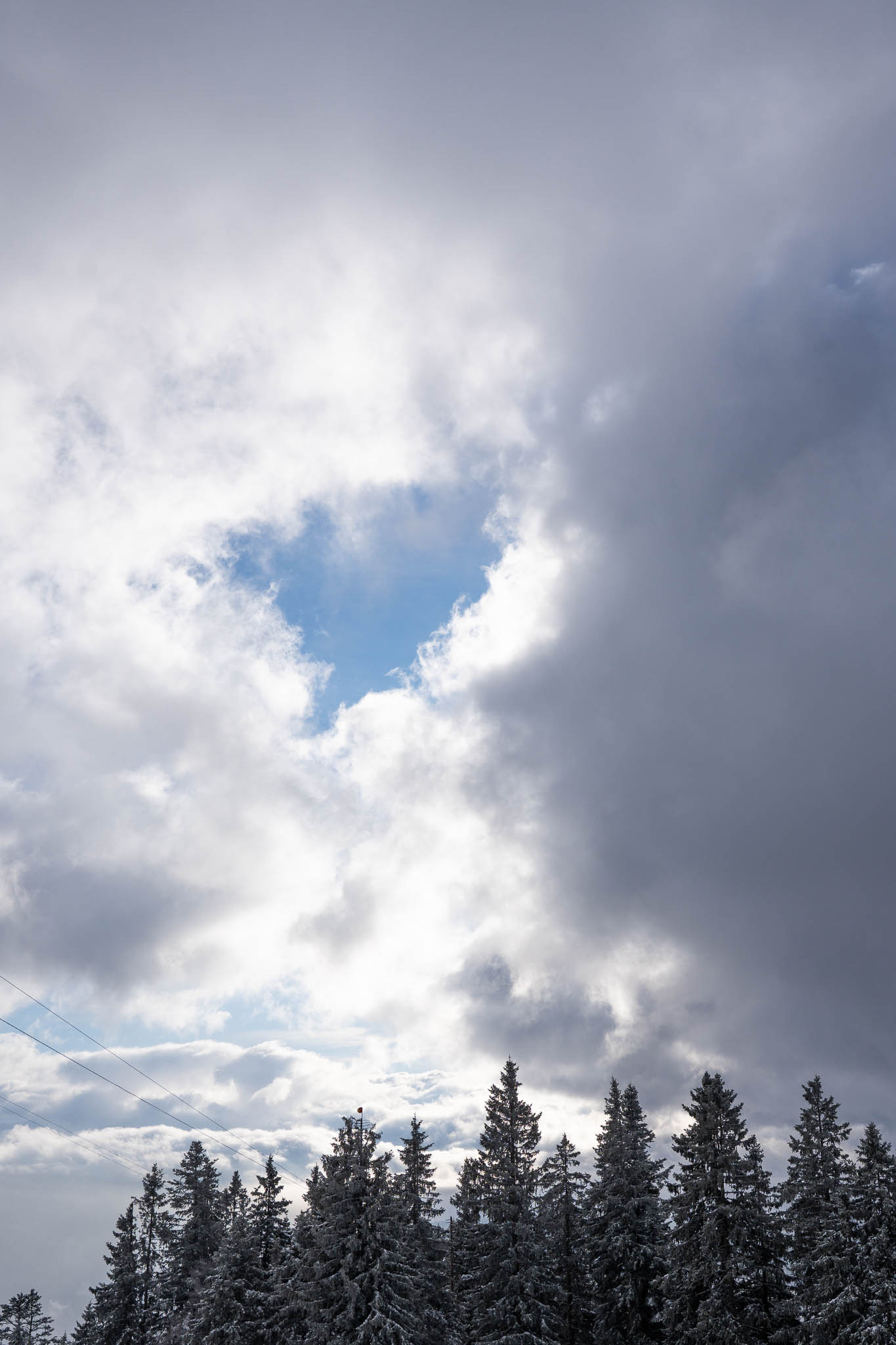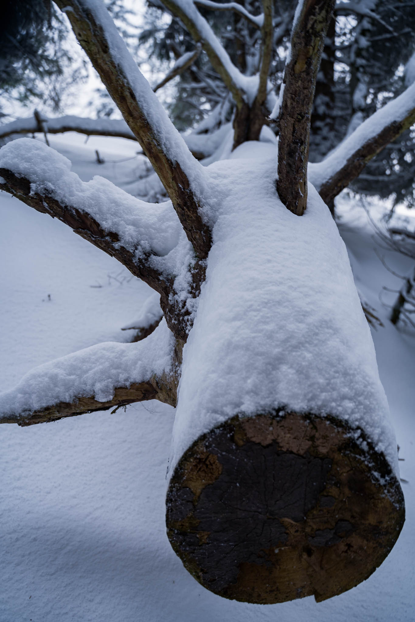 Vom Parkplatz aus steigen wir links neben den parkenden Autos bergauf und orientieren uns zunächst am Draxllift. Am Waldrand geht es über eine schmale Brücke bevor wir in den Wald eintauchen. Der Aufstieg führt weitgehend fern der Pisten durch verschneite Fichten. Die winterliche Stimmung im Wald begleitet uns die ganze Zeit – gedämpfte Geräusche, dick verschneite Äste, Nebelschwaden zwischen den Bäumen. Der gesamte Anstieg verläuft für uns heute im Nebel beziehungsweise unter dichter Bewölkung, was die Szenerie ruhig und mystisch wirken lässt.