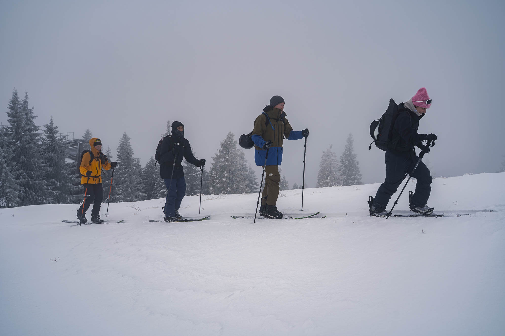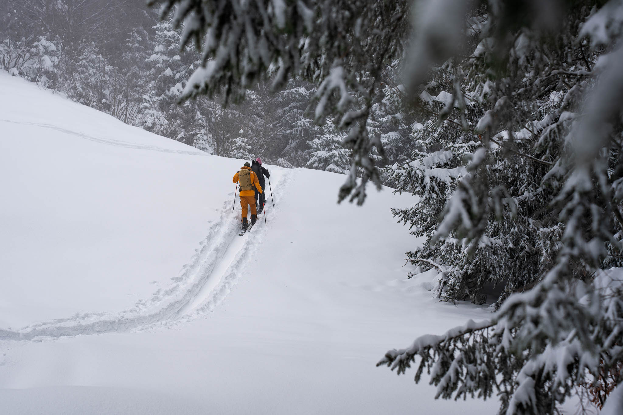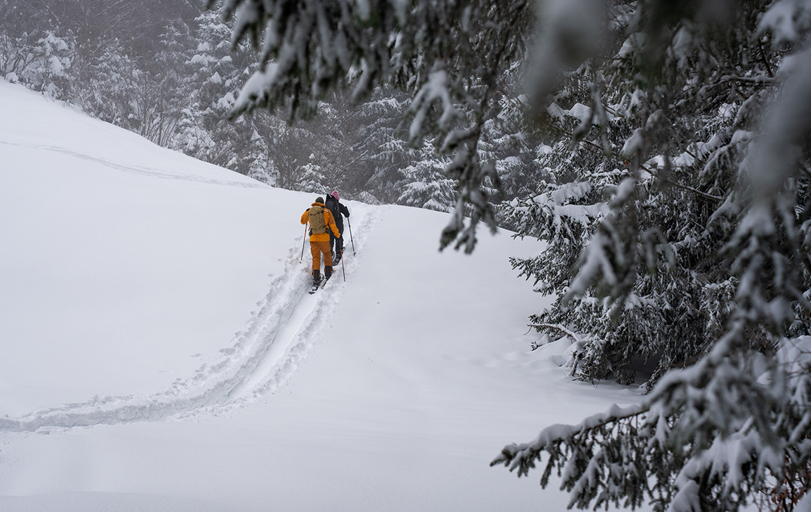 Da die Tour sehr beliebt ist, sind wir früh gestartet – und können es nur empfehlen. So waren die Hänge noch ruhig, die Spur relativ frisch und wir hatten den verschneiten Bergwald noch fast für uns allein. Außerdem hatten wir Freunde eingeladen, sich uns anzuschließen, und so waren wir schließlich eine Fünfergruppe – perfekt für einen gemeinsamen Wintertag am Berg.