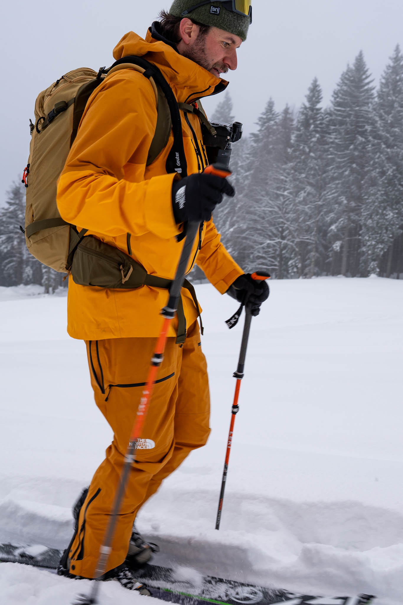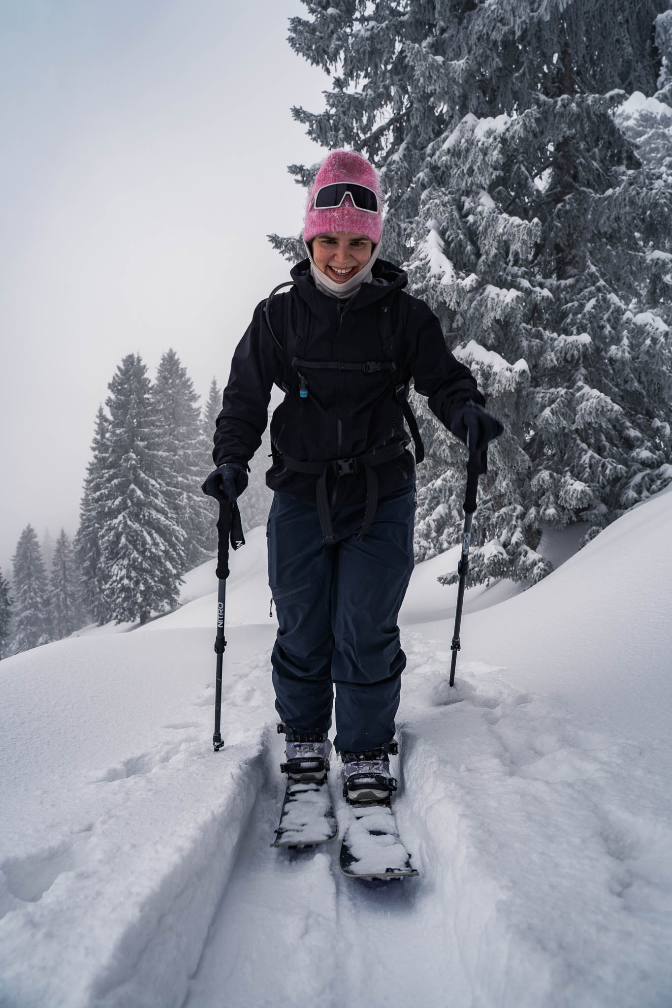 Die Abfahrt erfolgt anschließend im Skigebiet größtenteils auf der Piste, meist über die Familienabfahrt. Während wir im Aufstieg nur weniger gute Sicht hatten, genießen wir bei der Abfahrt weitestgehend klare Verhältnisse und griffigen Schnee. Mit der Neuschneeauflage gibt’s an der ein oder anderen Stelle sogar noch ein paar Spray-Turns zu holen. 🙂