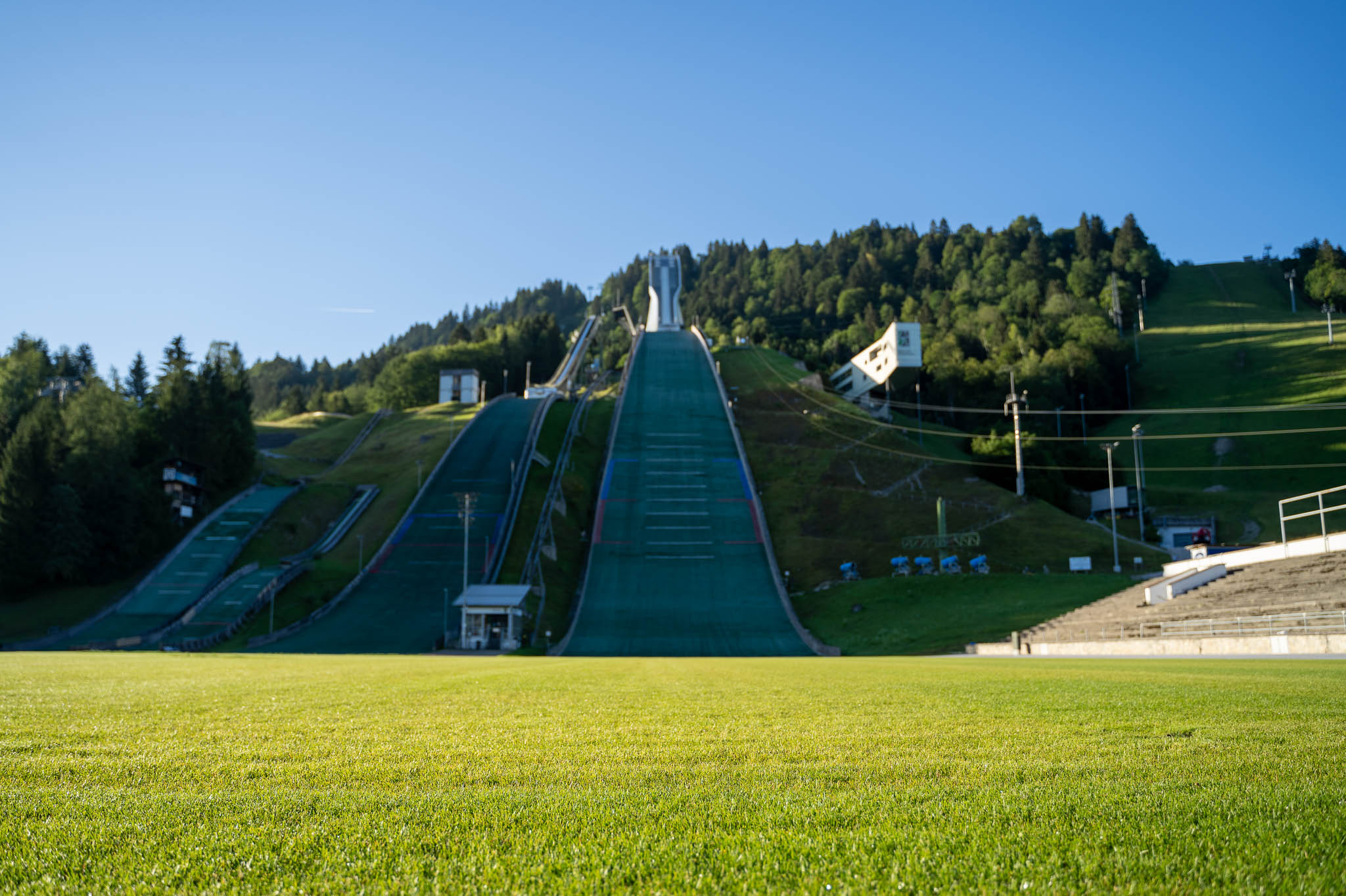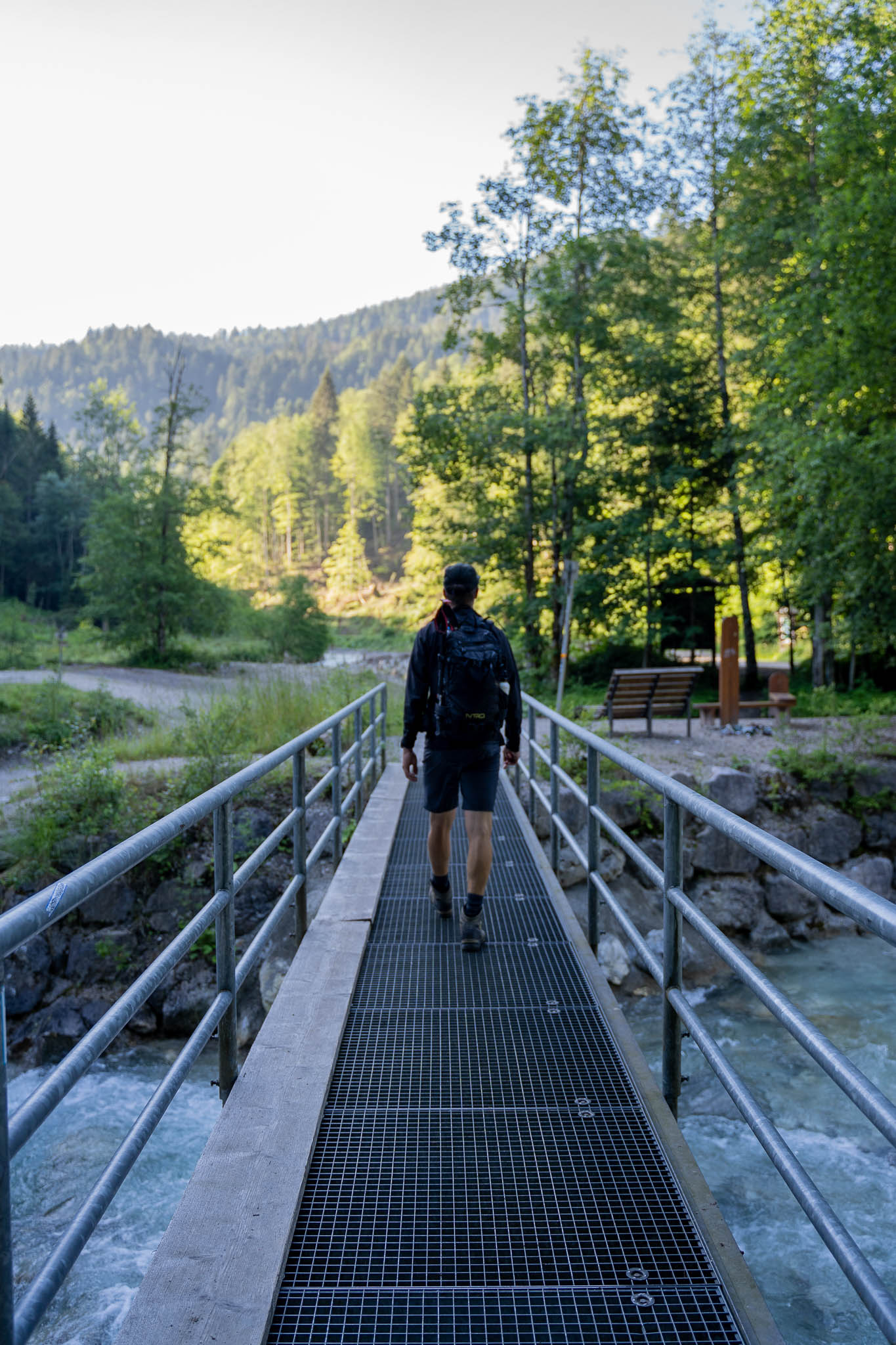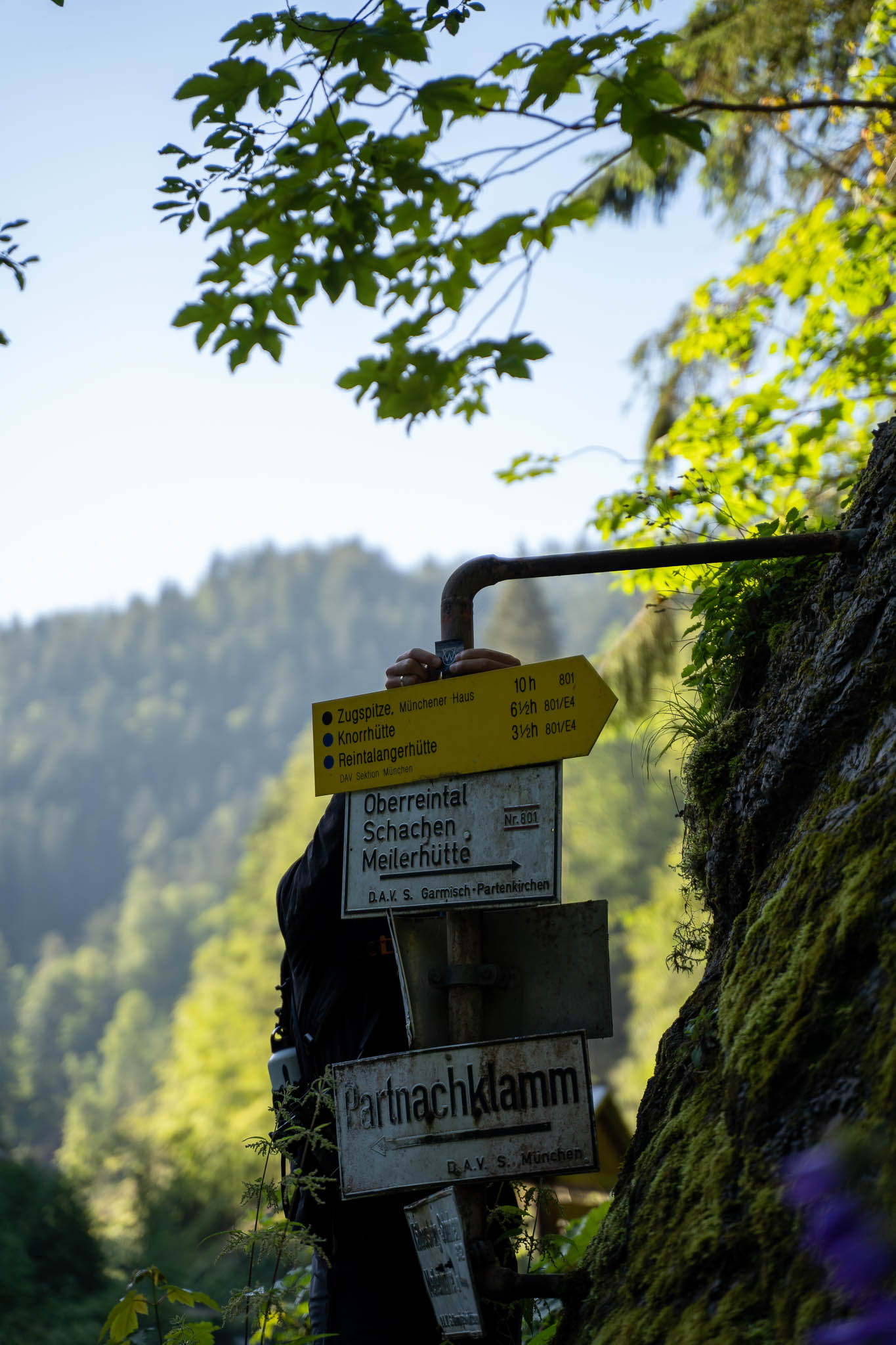 Los geht’s möglichst früh am Parkplatz bei der Skisprungschanze in Garmisch-Partenkirchen, also im Partenkirchner Ortsteil, wo wir uns zunächst auf einem geteerten Weg Richtung Partnachklamm warm laufen. Die Klamm ist je nach Jahreszeit inzwischen nicht mehr jederzeit frei zugänglich, daher kann es sein, dass hier bereits ein kleiner Umweg von ca. 200 Höhenmetern auf und wieder bergab in Kauf genommen werden muss. Wenn sie jedoch geöffnet ist, solltet ihr euch das Naturschauspiel nicht entgehen lassen. Das Eintrittsgeld und der Weg durch die Partnachklamm ist uneingeschränkt zu empfehlen. Wir haben an diesem Tag die Klamm allerdings ausgelassen, weil wir sie bereits kennen und sie so früh am Morgen noch gesperrt war.