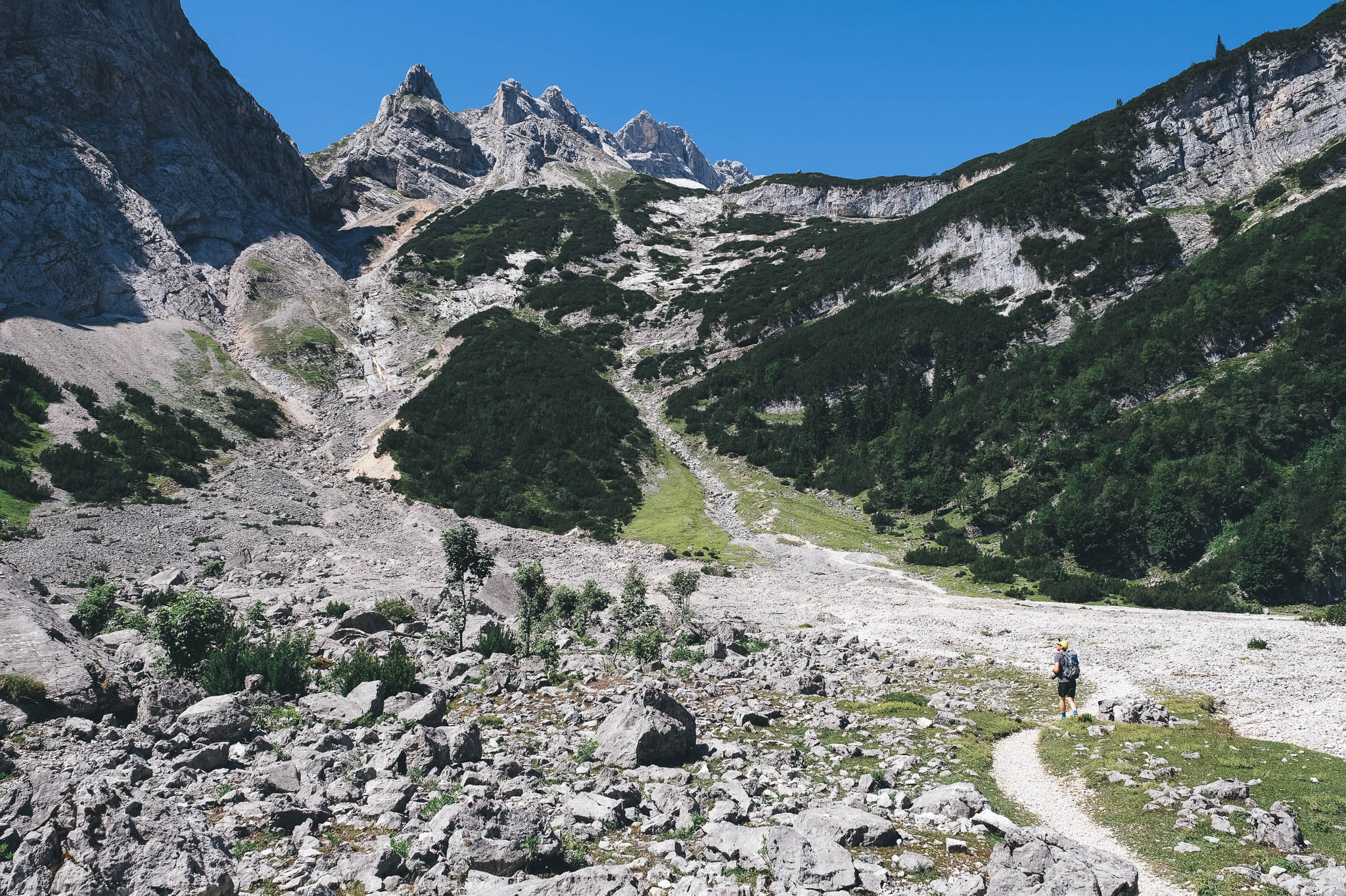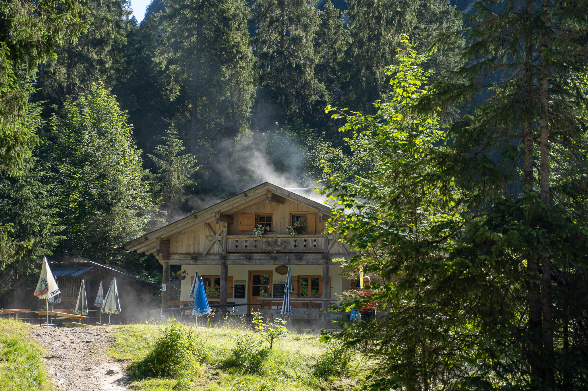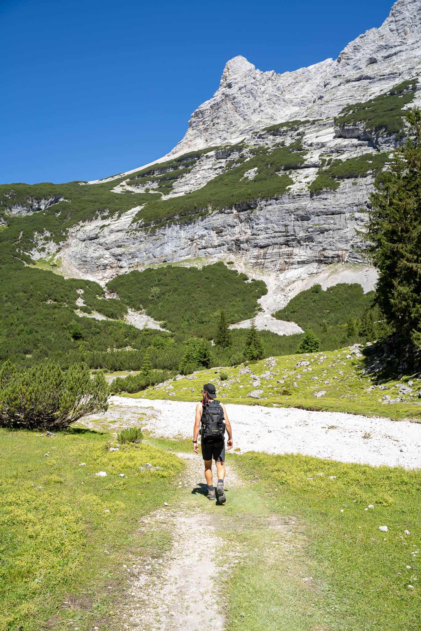 Am oberen Ende der spektakulären Klamm beginnt dann der etwas unspektakuläre Teil des gesamten Anstiegs – hier geht es erstmal in kaum spürbarer Steigung und ohne viel Abenteuer auf einem Fahrweg ins lange, aber landschaftlich wunderschöne Reintal. Erst kurz vor der Bockhütte wird der Weg langsam zum Wanderweg und die Steigung nimmt zu. Immer weiter, mit steil aufragenden Wänden rechts und links, geht es schnurstracks auf die Reintalangerhütte zu, die für viele Mehrtagestourler eine Übernachtungsmöglichkeit darstellt.