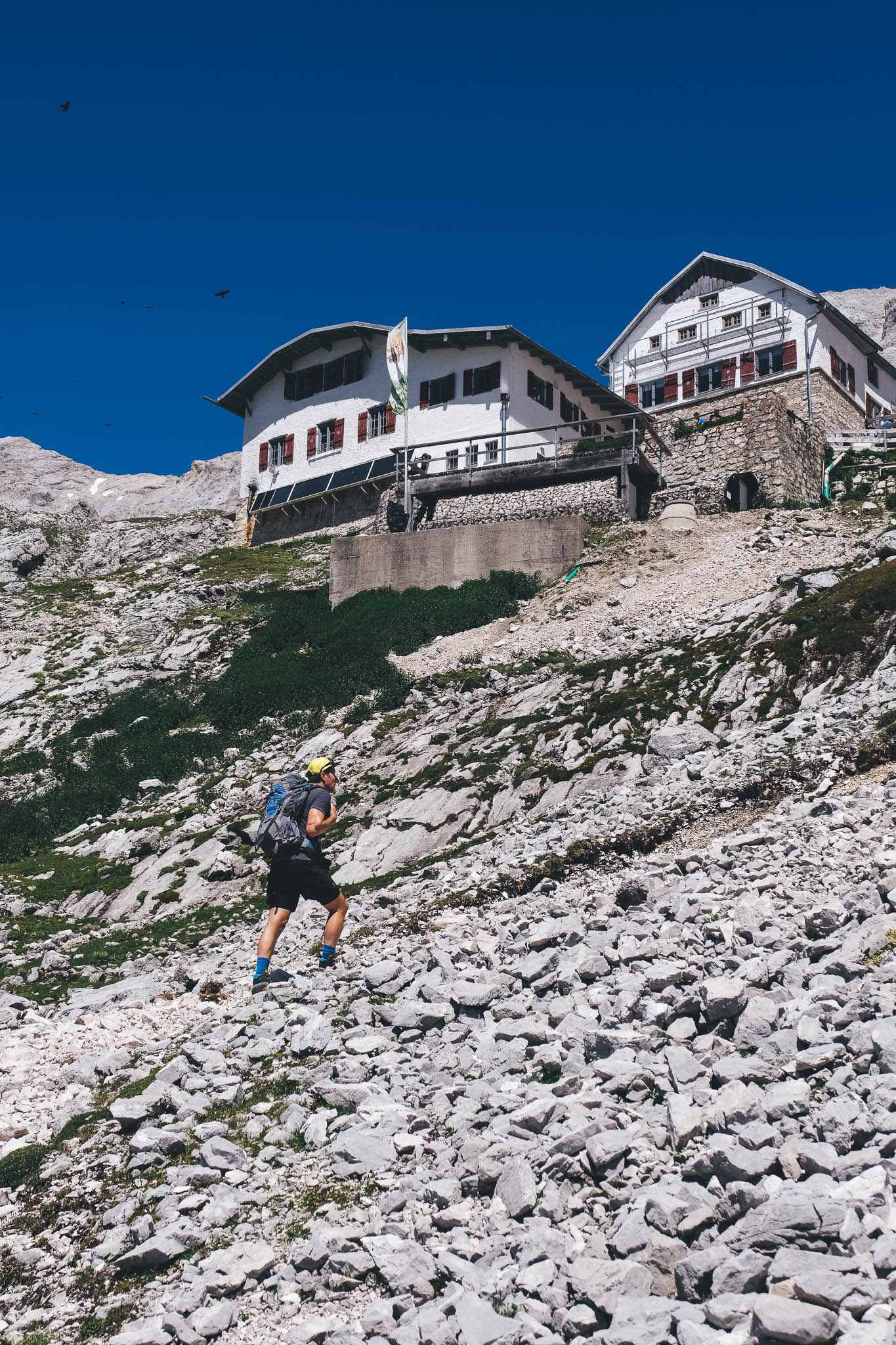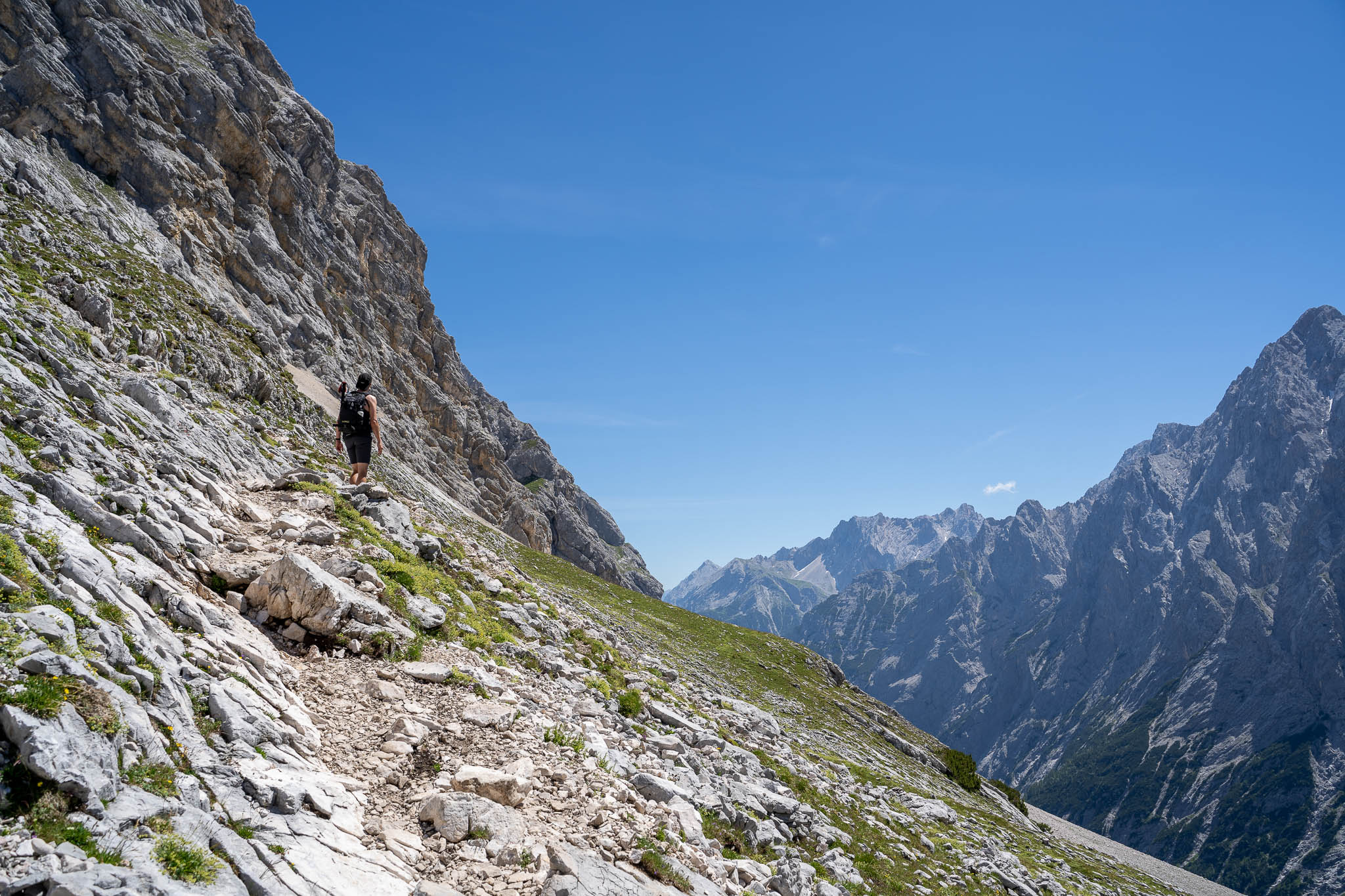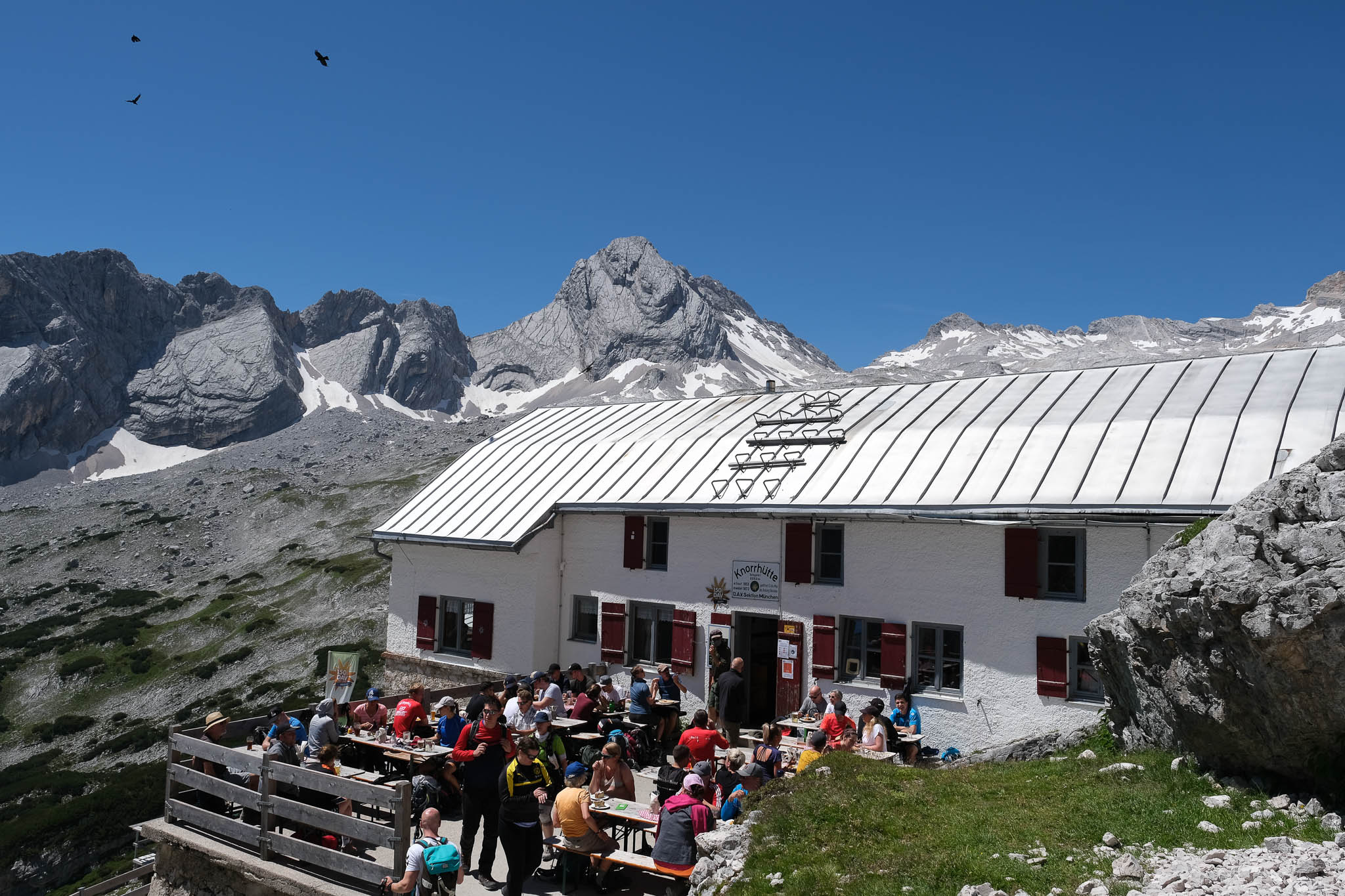Ab der Reintalangerhütte bis zur Knorrhütte hinauf geht es nämlich schon deutlich steiler zu und durch den fehlenden Schatten oberhalb der Baumgrenze kommen wir ordentlich ins Schwitzen. An der Knorrhütte ist es daher höchste Zeit, die Trinkblase bzw. Wasserflasche wieder aufzufüllen. Hier bietet sich übrigens für die gemütlicheren Berggeher die zweite Möglichkeit zur Übernachtungsrast an.