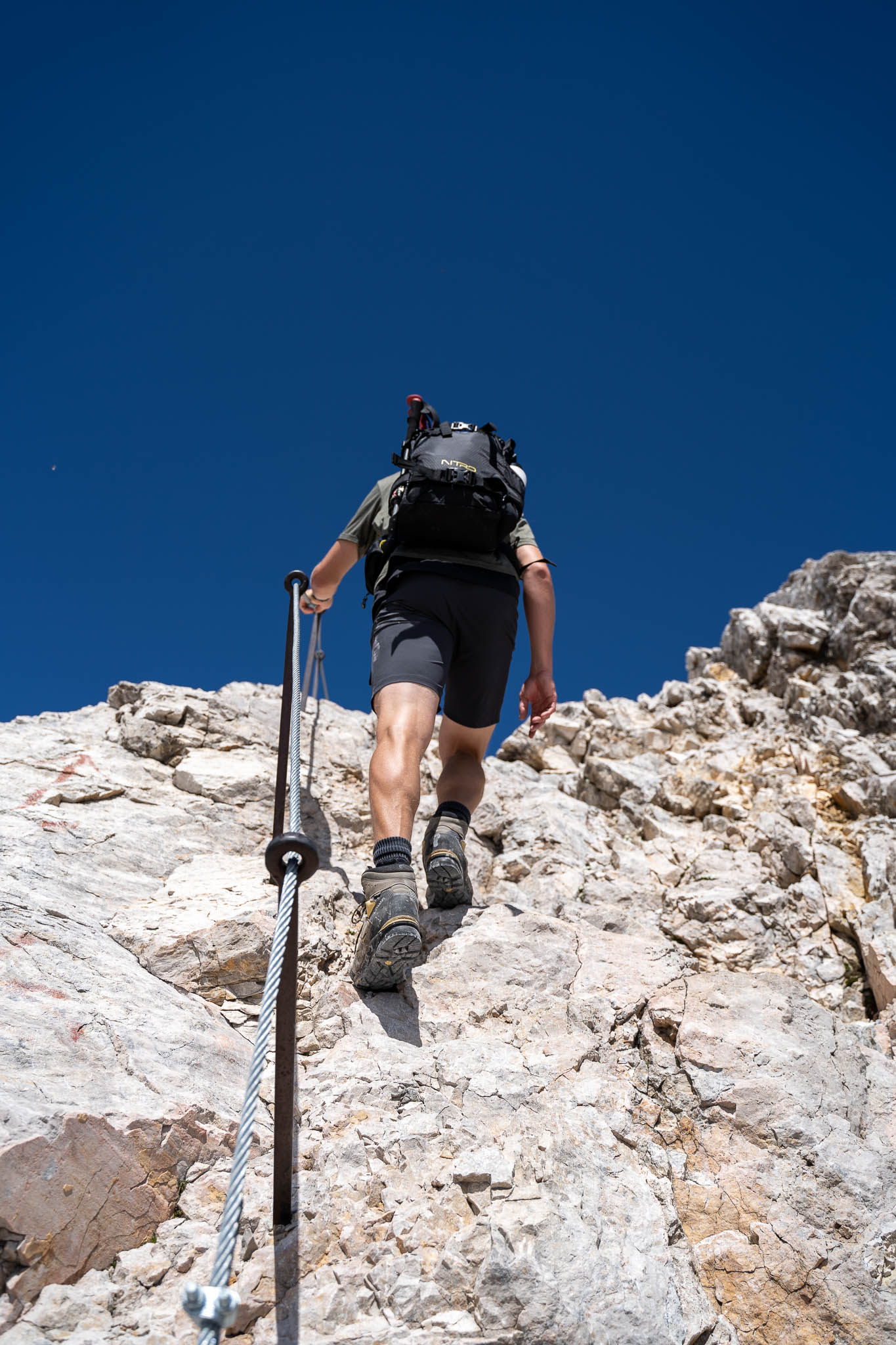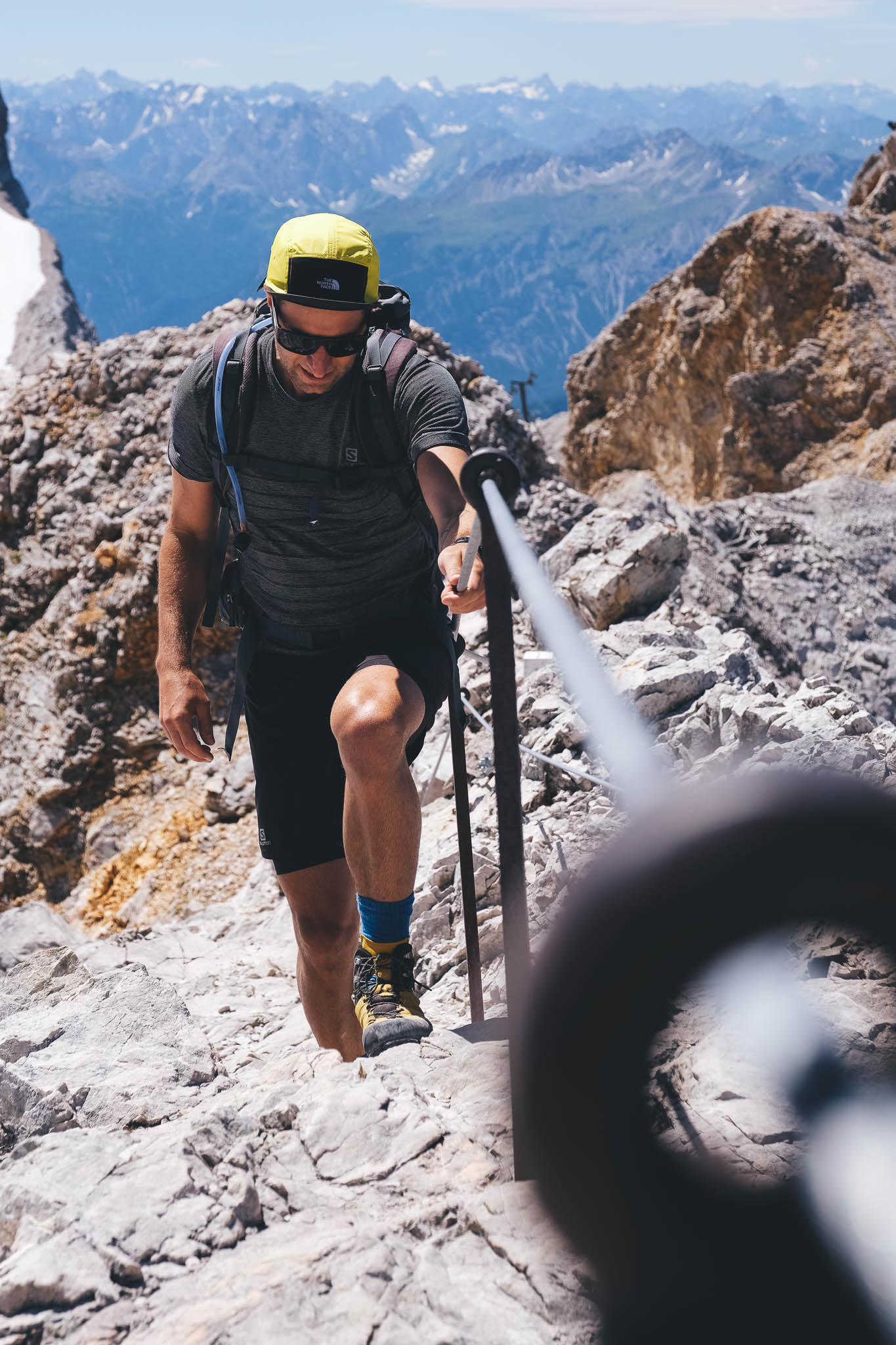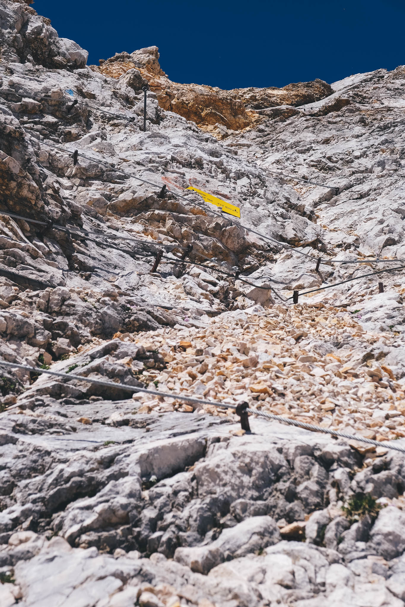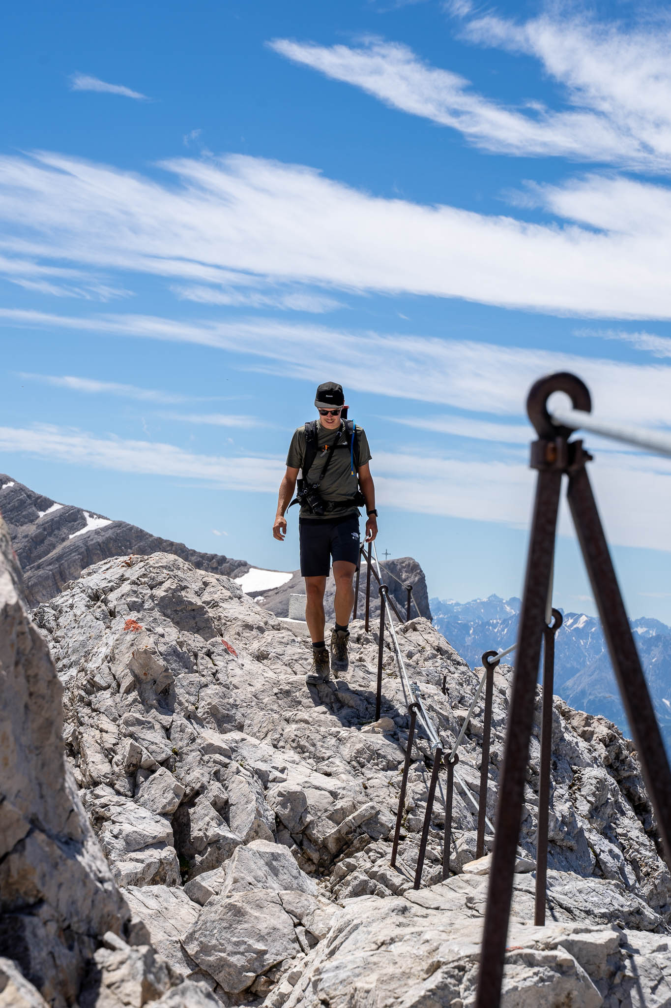 So richtig fordernd wird der Weg erst oberhalb des Zugspitzblatts/Sonnalpin. Von dort aus geht es zunächst durch ein unangenehmes Geröllfeld und schließlich an die letzen 150 Höhenmeter über einen Steig, der aber sehr gut seilversichert ist. Hier ist trotzdem Ausdauer und Konzentration genauso wichtig wie auf den allerletzten Metern zum goldenen Gipfelkreuz!