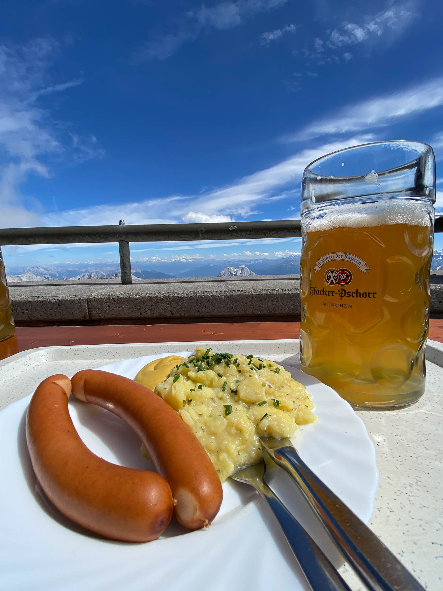 Das Gipfelfoto ist nach der Schinderei aber natürlich obligatorisch, bevor wir in der Zahnradbahn die Füße hoch legen können. Vorher gab es aber noch eine kleine Stärkung auf der Terrasse der DAV Hütte „Münchner Haus“.